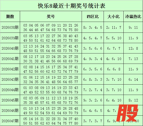 福彩快乐8第2026047期开奖回顾:05 14 16 21 22 28 31 34 37 40 50 51 55 62 63 64 74 75 77 80,其中奖号四区比为3:7:3:7,冷温热码比为6:9:5,大小比为10:10,和值为899,同尾号码为40 50 80、21 31 51、22 62、14 34 64 74、05 55 75、37 77。